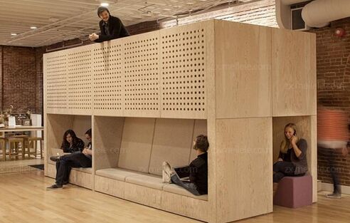 辦公室的設計非常的隨意,其實整個辦公室的面積是非常大的,除了最顯眼的圖中的長方體幾何辦公家具,旁邊也設置的有常規的辦公家具,人們可以隨意的選擇在哪里辦公。辦公室的創意就體現在整個幾何立體家具上面,其使用實木、鋼材和海綿一起組合搭配成的。人們可以坐著辦公,也可以靠著辦公,非常的隨意,自由而且舒適,大家可以完全放寬心來工作。