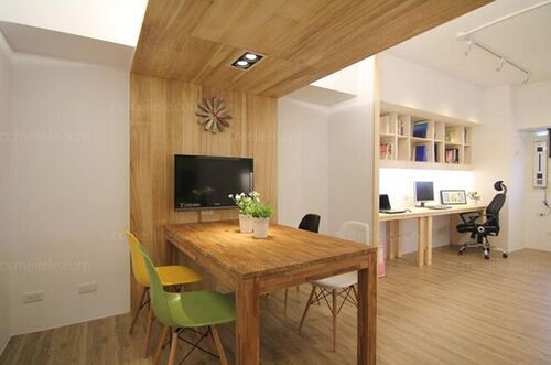 典型的家庭辦公室設計。通常情況下,我們的居室面積都不是非常的寬敞,所以在保證我們有多余的活動空間的時候,要設計好家庭辦公室不是一件容易的事情,而下面的辦公室就做到了。案例中,是將室內原本的客廳裝修成辦公室的,所以靠近辦公室的地方就是餐廳這個地方。不過餐廳和客廳一起組合在一起了,大大的節約了空間,辦公室的活動地方更大了。