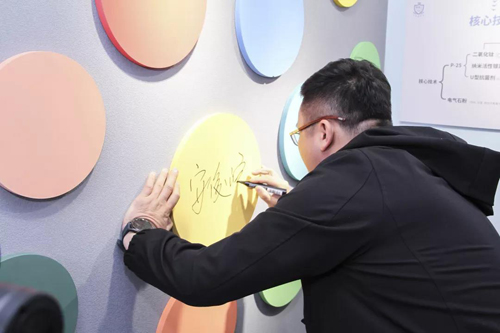 這片顏色螺旋墻,有著非常重要的意義,六大圓形面板象征著董事會的六位成員,緊接著是十個中面板象征著我們的管理高層,最小的圓形面板象征著我們千千萬萬的美博士人,我們所有人都團結在董事長周圍,未來通過我們大家的努力,壁材事業一定能勇攀事業最巔峰!
