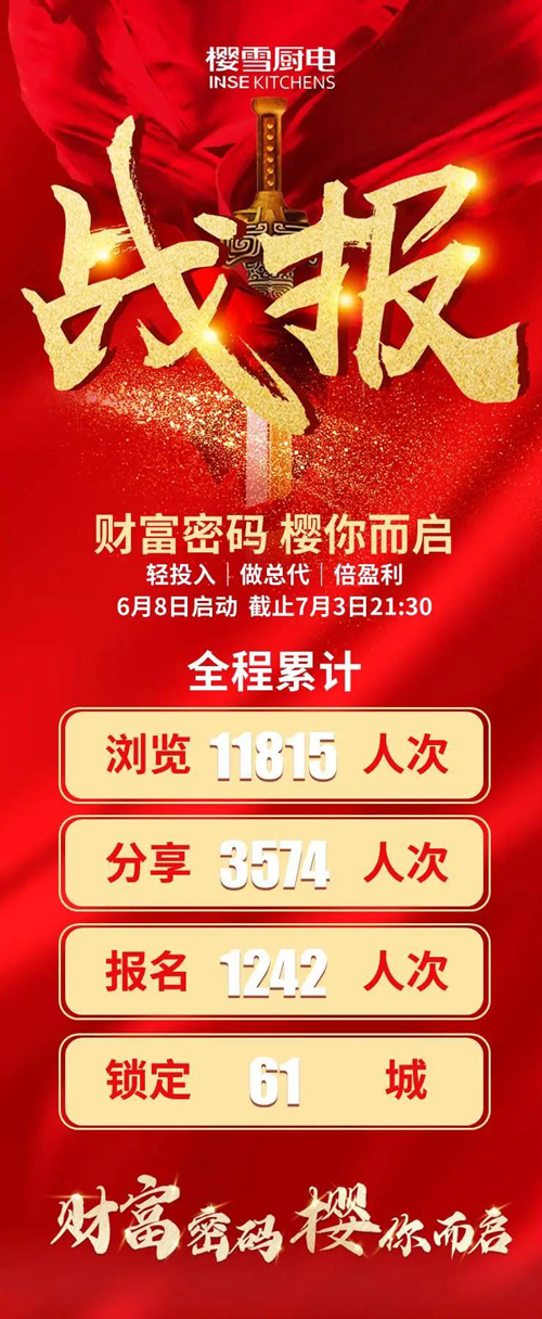 截止到7月3日21:30,本次活動瀏覽觀看人數達到11815人,吸引了全國1242名意向客戶報名,共有61城的意向客戶簽約加盟櫻雪廚電!