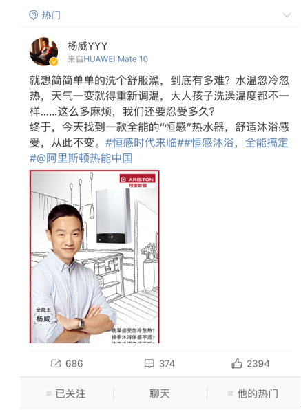 楊威的全能形象早已深入人心,與阿里斯頓恒感燃?xì)鉄崴鬟m應(yīng)百變天氣的特點(diǎn)相得益彰,彰顯了產(chǎn)品“沐浴全能”的特性,讓“恒感”這個(gè)新生的概念變得家喻戶曉,更引起了寶寶家長(zhǎng)的共鳴。