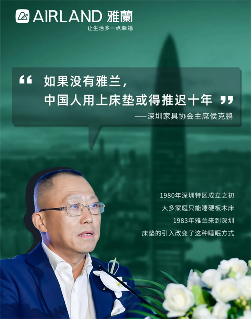 1983年,雅蘭乘著改革開(kāi)放的春風(fēng)來(lái)到深圳投資設(shè)廠,成為第一批在深圳投資的港資企業(yè),也由此拉開(kāi)了內(nèi)地彈簧床墊的時(shí)代序幕。深圳家具行業(yè)協(xié)會(huì)主席侯克鵬先生曾深情感嘆道,“如果沒(méi)有施生(雅蘭創(chuàng)始人),中國(guó)人用上(彈簧)床墊或得推遲十年。”