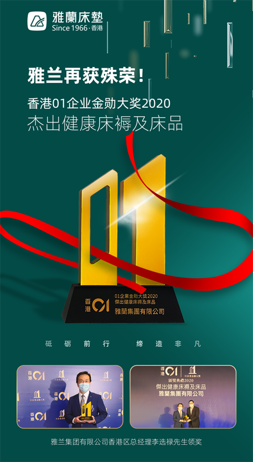 1月25日,香港知名媒體機(jī)構(gòu)《香港01》舉辦的“01企業(yè)金勛大獎(jiǎng)2020”在香港隆重舉行, 雅蘭集團(tuán)受邀出席大會(huì),并在優(yōu)質(zhì)生活品牌組別中脫穎而出,現(xiàn)場(chǎng)獲頒“01企業(yè)金勛大獎(jiǎng)2020 - 杰出健康床褥及床品”獎(jiǎng)項(xiàng)。