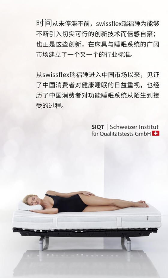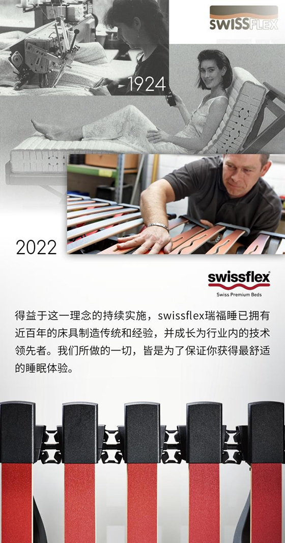 在瑞⼠,在阿爾卑斯⼭脈下,瑞⼠⼈遵從把產(chǎn)品當做是上帝⼀樣崇拜,內(nèi)⼼是⾮常的虔誠,⽤⼼的把產(chǎn)品做到極致,正是這樣虔誠的態(tài)度造就了瑞⼠⼀項⼜⼀項的創(chuàng)新和傳承,以虔誠的⼼態(tài)來做好每⼀件產(chǎn)品,作為整個歐洲睡眠⾏業(yè)的隱形冠軍,近百年以來堅持設(shè)⽴瑞⼠唯⼀⼯⼚,嚴苛檢驗標準的保證了品質(zhì)⼀如既往的優(yōu)異,帶有仿⽣bridge®智能橋睡眠系統(tǒng),⼜⾛在了科技創(chuàng)新的前沿,正是這樣虔誠的態(tài)度⽣產(chǎn)制造 , swissflex®瑞福睡榮膺瑞士質(zhì)量測試協(xié)會。(SIQT)“2022/23質(zhì)量⼤獎”。