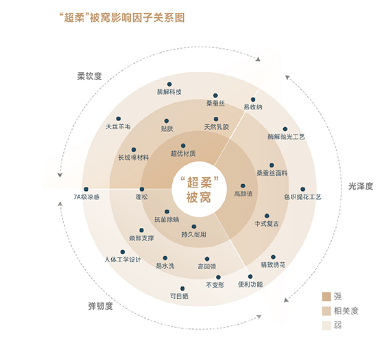 數據顯示,基于消費者對于超舒適被窩的討論度,“柔軟度”、“光澤度”與“彈韌度”成為支撐超柔被窩的三大核心影響因素。