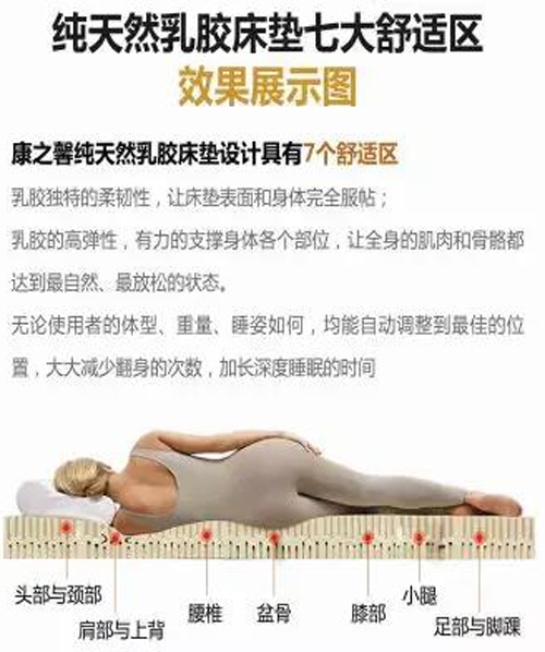 乳膠床墊接觸人體的面積要比一般床墊接觸人體面積多出不少,它可以分散人體重量的承受力,達到全方面支撐,具有矯正不良睡姿的功能。乳膠床墊具有高彈性,可以滿足不同體重人群的需要。和其他種類床墊相比,乳膠床墊不會產生噪音,無震動,有促進睡眠的作用。將頭部重量平均吸覆,達到全方面支撐著,使你舒適安穩的入睡。