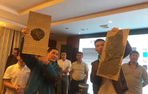 當介紹到純珍S66砂漿膠的時候,現場做了一個砂漿對比,添加了S66的砂漿在瓷磚上180°倒立竟安然無事,師傅們發自內心的喝彩鼓掌,場面異常熱烈。