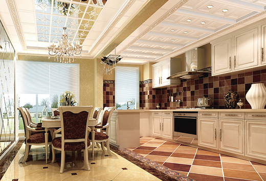 采用實木材質,配合現代化的廚房用品,給人帶來一種現代家居的時尚與輕巧。白色的集成吊頂顯得十分的霸氣。菱形的LED燈與吊頂花紋緊密配合,使廚房更具有規則性,讓整個廚房空間更加緊密了,有條不紊。當溫柔的燈光籠罩廚房時,一種溫馨的氛圍就不由自主散發出來了。