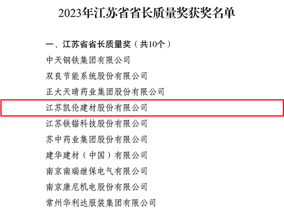 近日,2023年江蘇省省長質量獎獲獎名單正式公布。江蘇凱倫建材股份有限公司多年來在高分子防水材料細分領域的精耕細作和堅守當擔,贏得了省政府的認可與嘉獎,成為10家省長質量獎獲獎企業(yè)之一,也是蘇州市唯一一個上榜企業(yè)。