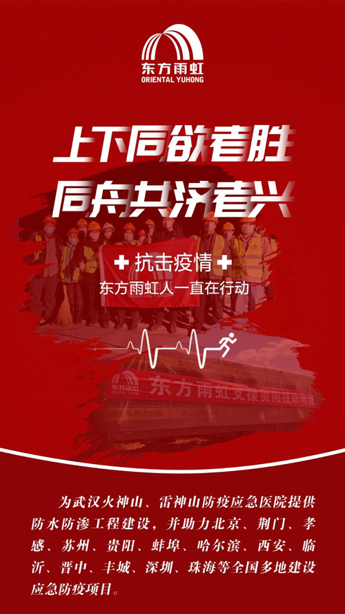 “產業報國,服務利民”。疫情如命令,責任如生命,面對如此嚴峻的疫情考驗,東方雨虹作為中國建筑建材系統服務商,排除萬難,支援抗疫應急建設是我們的責任與義務。竭力為“抗疫一線”提供馳援,為“抗疫戰地”提供保障。