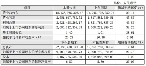 東方雨虹公告稱,報告期內,公司實現營業總收入18,138,935,302.47 元,較上年同期增長29.14%,主要系隨著公司品牌影響力不斷提升,產品銷量同比增長,材料銷售業務和施工服務業務規模均有所增長所致;營業利潤2,651,647,786.52元,較上年同期增長45.89%,利潤總額2,621,428,266.1 7元,較上年同期增長43.89%,歸屬于上市公司股東的凈利潤2,085,112,359.63元,較上年同期增長38.25%,基本每股收益1.40元,較上年同期增長38.61%,主要原因是報告期公司營業狀況整體向好,主要產品的銷售收入、施工收入繼續增加,毛利潤逐步提高所致。