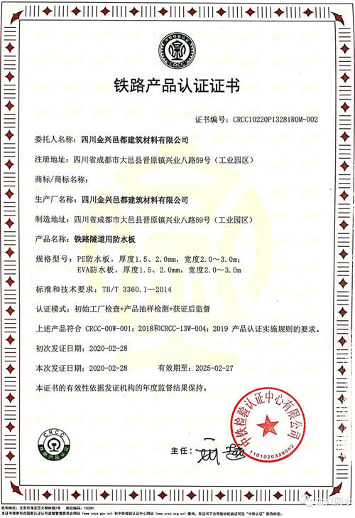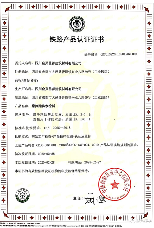金興防水2大類4個產品獲取中鐵檢驗認證中心簽發的《鐵路產品認證證書》(證書編號:CRCC10220P13281ROM-001、CRCC10220P13281ROM-002)。這是我公司首次獲得鐵路產品正式準入資格,標志著我公司防水產品不僅能滿足國家有關生產制造、質量管理標準的要求,更能達到國家鐵路、城規等行業的高標準要求。