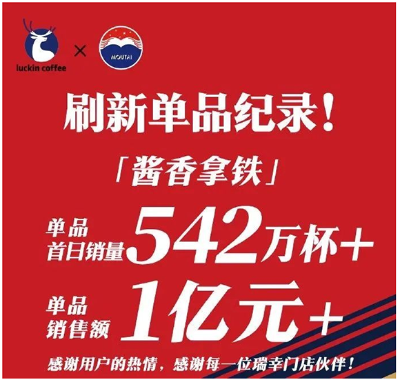 據瑞幸官方9月5日消息,醬香拿鐵單品首日銷量突破542萬杯,單品首日銷售額突破1億元。毫無疑問,茅臺將“擁抱年輕人”定為茅臺發展的主旋律之一,和蒙牛聯名賣茅臺冰淇淋,和必勝客聯名賣榴蓮披薩,這次又和瑞幸聯名賣咖啡,徹底是火出圈了。