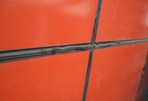 2.溫差大。接口熱脹冷縮使板塊位移規律滑移,這種情況多數在鋁塑板幕墻中容易出現。鋁塑板是線膨脹系數較大的材料,特別是北方的春、秋兩季晝夜溫差較大,使得未硫化完全的硅膠受拉伸、壓縮而起皺形成棱狀紋路,從而密封膠表面出現凹凸不平。