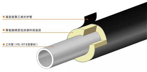 工作管即PERTⅡ型管,其抗沖擊、耐開裂,且柔韌性和長期蠕變性能好,具有與傳統(tǒng)高密度聚乙烯相同的良好的耐低溫性能,還擁有優(yōu)越的耐熱性能以及高溫條件下優(yōu)異的長期靜液壓強(qiáng)度,因此適用于工業(yè)用及民用建筑冷熱水管路系統(tǒng)、以及高溫?zé)崴艿老到y(tǒng)等,尤其在北方應(yīng)用于城鎮(zhèn)供熱系統(tǒng)二次管網(wǎng)以及溫泉保溫管道系統(tǒng)。