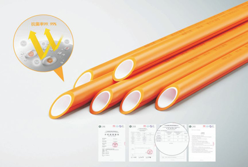 管材內(nèi)層白色抗菌層中添加納米級(jí)銀系無機(jī)抗菌劑,管材通水后,Ag+不斷從管材中釋放出來,與水中菌體結(jié)合,破壞結(jié)構(gòu)并使其喪失活性,進(jìn)而達(dá)到殺菌抗菌作用。經(jīng)國家權(quán)威機(jī)構(gòu)檢測(cè)證明,抗菌率高達(dá)99.9%,符合JC/T939-2004Ⅰ級(jí)抗菌最高檢測(cè)標(biāo)準(zhǔn)。