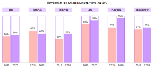 國貨美妝品牌整體競爭激烈,頭部品牌變化大。防曬、潔面和眼部產品更加明顯。
