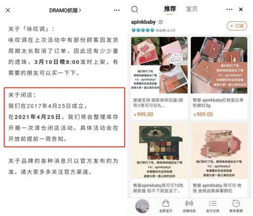 ▲左:截自DRAMO抓貓公眾號通告 ▲右:截自Apinkbaby淘寶唯一店鋪