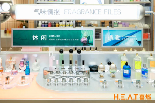 H.E.A.T喜燃首店開業(yè)時,以三大品類為主,即彩妝香氛、護膚和個護,分成了三大版塊陳列。