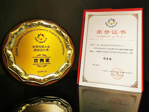 2020年11月18-20日,全球飾面大會(GDSC)暨第九屆裝飾紙與飾面板定制家居產業鏈發展峰會在浙江杭州盛大召開。德硅•雷諾麗特3款各具特點的花色在大會同期的“原創設計秀”現場展示,并榮獲了1個優秀獎和2個入圍獎的佳績。