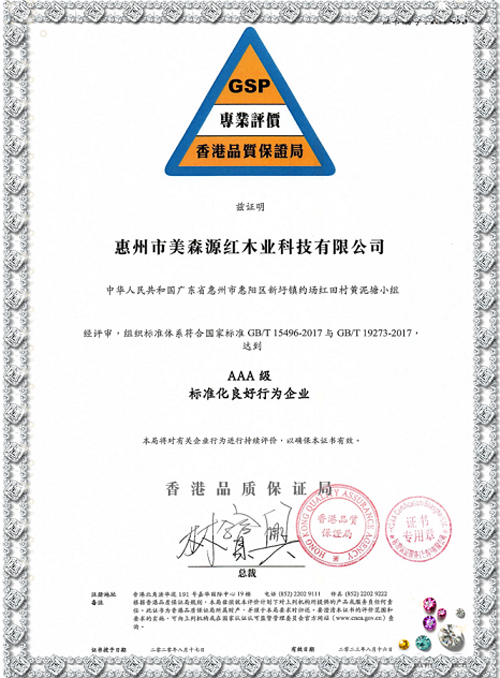 惠州市美森源紅木業(yè)科技有限公司:榮獲香港品質(zhì)保證局頒發(fā)AAA級(jí)標(biāo)準(zhǔn)化良好行為企業(yè)認(rèn)證證書