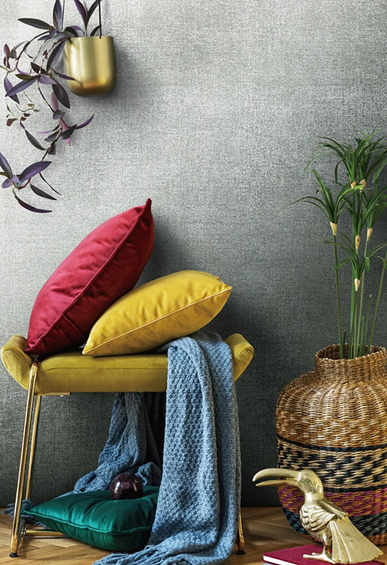 銀砂拉布紋的手法下,灰色的肌理中透著沙粒般的閃亮,仿佛橫豎交錯的點點星光,盛開著漫天的火樹銀花。搭配高飽和度亮色系軟裝,點綴古樸草編裝飾,異域的名族風格撲面而來,營造出 充滿遐想的雅致空間。