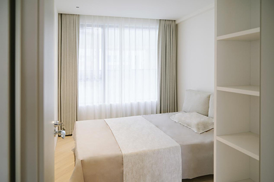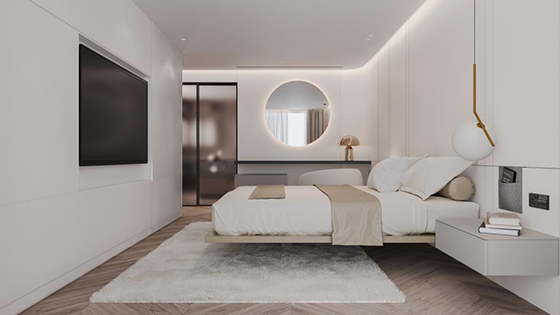 向內(nèi)深入,臥室?guī)е驼{(diào)舒適慢慢顯現(xiàn)。主臥設(shè)計了一個女生們夢寐以求的精細化分區(qū)衣柜,涵蓋衣物區(qū)、香水和護膚品&日化品區(qū)。智能密碼抽、皮革收納抽屜柜、衣物收納籃、升降緩沖掛衣桿、黑胡桃木褲架等一應(yīng)俱全。一門到頂?shù)睦漤嵃滓鹿衽c墻面融為一體,自然簡約,臥室更顯干凈。柜門運用膚感雙面PET材質(zhì),不僅觸感細膩,還保證了健康環(huán)保。同時主臥還有另一個一門到頂?shù)氖占{柜,中間開放格可放置小電器,配合移動軌道插座,使用方便。