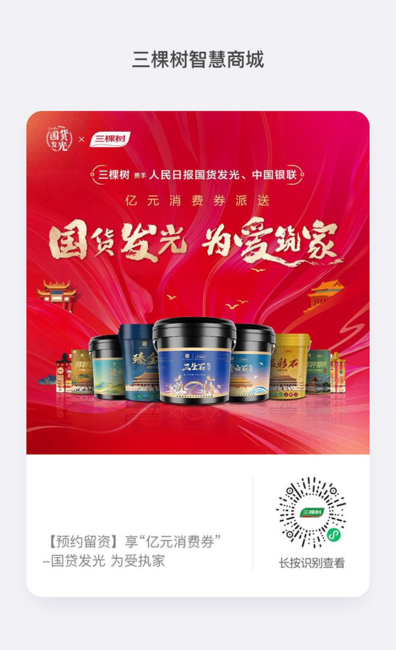 從國家重大工程到美麗鄉村建設,三棵樹涂料遍布全國,盡顯國貨品牌的責任與擔當,也為我國涂料行業品牌邁向“世界級涂料企業”奠定了堅實基礎。此次,人民日報文創“國貨發光美好生活季”活動,攜手三棵樹,聚焦人民美好生活建設議題,通過發放惠民消費券形式,為消費者帶來實實在在的優惠活動,不斷滿足人民群眾對居家生活的美好向往,為推動家居行業的蓬勃發展添磚加瓦。