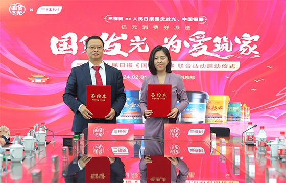 為了響應國家《關于促進家居消費的若干措施》的政策號召,讓更多用戶享受健康環保的綠色產品,煥新家居空間東方美學文化魅力。2024年2月1日,三棵樹與人民日報國貨發光、中國銀聯正式簽約,重磅開啟“國貨發光•為愛筑家”億元消費券全國派發活動,這不僅意味著全民共享國貨消費紅利時代的開啟,同時也展現出三棵樹作為龍頭涂料品牌引領家居消費高品質升級的責任與擔當。