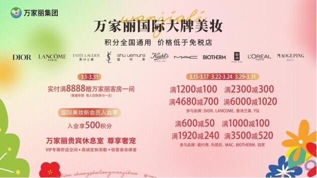 春日煥新顏,變美正當時。萬家麗春季美妝節浪漫來襲,3月15日-3月17日、3月22日-3月24日、3月29日-3月31日,DIOR、LANCOME、雅詩蘭黛、YSL滿1200減100,滿2300減300,滿4680減700,滿6000減1020;植村秀、科顏氏、MAC、Biotherm、羽西,滿600減50,滿1000減100,滿1920減240,滿3500減520,歐萊雅、毛戈平、林清軒、珀萊雅抵店更有超多滿額買贈驚喜等著你!3月1日至3月31日,實付滿8888元贈萬家麗國際大酒店客房一間。即日起,新會員享入會即享500積分,積分最高可兌滿1000減130美妝券,會員更有尊享VIP專屬貴賓休息室,不定期上線美妝課堂,積分兌換好禮,給你滿分寵愛。萬家麗國際大牌美妝,積分全國通用,價格低于免稅店,更多美妝福利,等您進店探索!