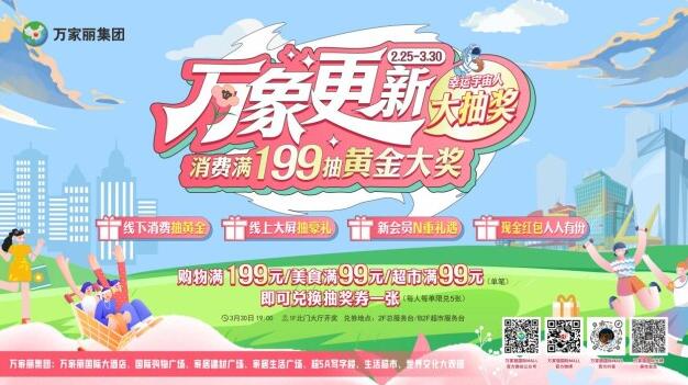 幸運大抽獎,豪禮帶回家。2月25日-3月30日,在萬家麗國際購物廣場全場單筆消費滿199元,美食類單筆消費滿99元,萬家麗生活超市消費滿99元,均可兌換抽獎券一張,每人每單限兌5張,3月30日19:00開獎,抽黃金飾品、華為手機、豪華客房券、超市購物卡、大牌美食券等重磅福利。3月30日活動當天,加入萬家麗粉絲群,抽10位幸運錦鯉送出無門檻美食券;關注“萬家麗國際MALL”微信公眾號,更有三輪現金紅包雨大派送……快來宇宙中心解鎖你的春日福氣吧~