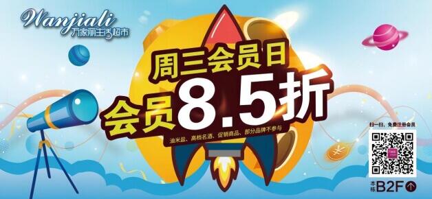 購物囤貨就來萬家麗生活超市,超值超實惠,省錢更省心。萬家麗生活超市每周三會員享全場8.5折(油米鹽、高檔名酒、特價商品不參與),且消費滿額尊享免費停車,更有不定期好禮相送。還在等什么呢,快去購物吧~