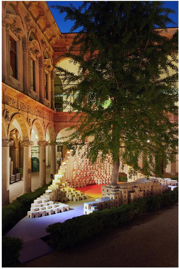 由陶瓷塊元素構成的半圓形背景高達4.5米,優(yōu)雅的曲線設計完美地適應了三角形的場地,與米蘭大學的庭院背景完美融入。這些多功能的陶瓷塊不僅僅在視覺上吸引觀眾,同時還能轉變?yōu)樾蓓瑓^(qū),讓大家可以在這個充滿活力的空間里放松、社交和互動。