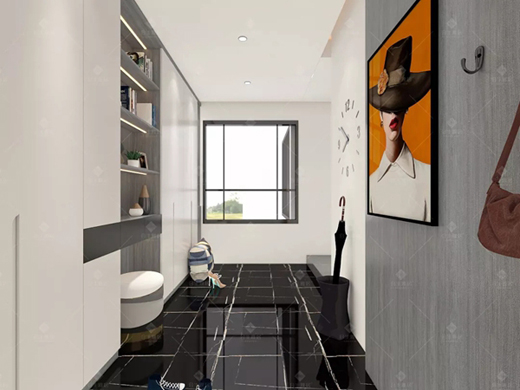入門是黑色拋光瓷磚搭配雅致白頂柜,鞋柜隱藏其中,令整體空間簡潔大方;開放區(qū)擺放配飾和和收藏物,搭配鮮艷色彩墻畫,點綴出空間靈動感,同時也凸顯主人公的生活品味。