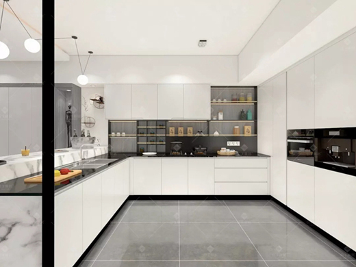 U型櫥柜功能性分明,儲物空間大。開放柜與封閉柜相結(jié)合,既美觀又方便擺放和儲藏物品,避免雜亂無章,打造出干凈利落的視覺感受,設(shè)計極具現(xiàn)代感。