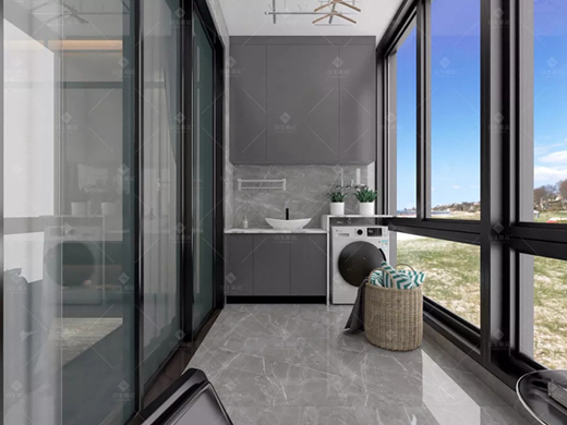 充分利用陽臺一角可以解決很多空間問題,內(nèi)置洗衣柜和洗手臺,可以劃分出一個洗滌專用區(qū)域,不僅大大節(jié)省了居室空間,同時方便晾曬。