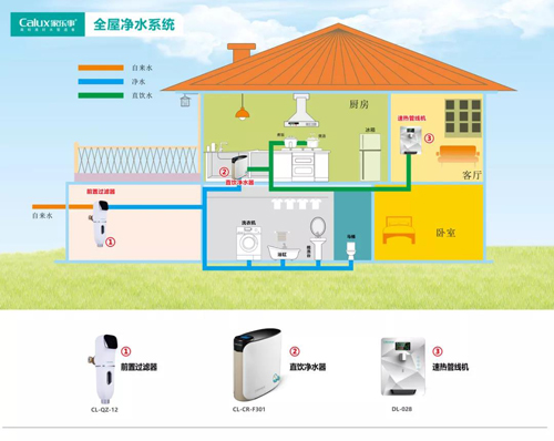方案四:CL-12超大通量前置過濾器+F301純水\富鍶水雙水機+速熱管線直飲機,適用于追求飲水品質的家庭全屋凈水。