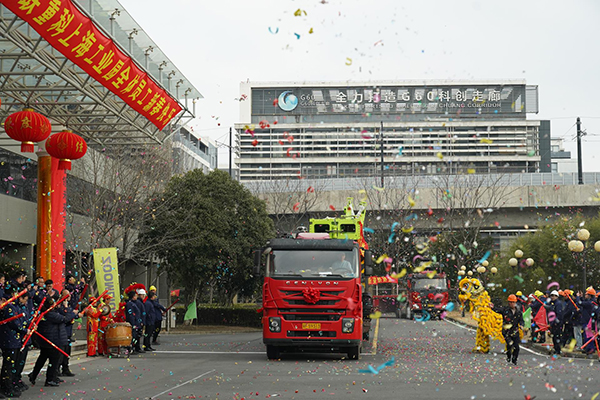 當天,隨著一聲“發車!”號令,現場鞭炮齊鳴、爆竹聲聲,中聯智慧產業城四大園區同時發車,四支車隊浩浩蕩蕩,從園區出發,經過總部大樓接受檢閱,開啟闊步全球的新篇章。