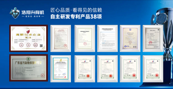 浩翔升降機始終堅守品質底線,已成功獲得特種設備生產許可證《TS2444360-2027》、質量管理體系認證《GB/T 19001-2016/ISO 9001:2015》及高新技術企業認證《GR202344017911》,以權威資質背書產品合規性、可靠性與創新力。