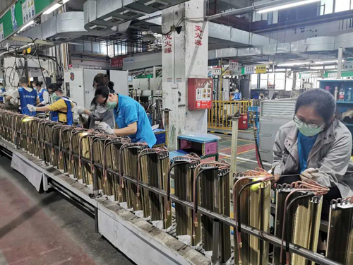 綿陽空調公司這支馳援隊伍涵蓋了焊接、商檢、高沖、彎管、調試等多個技術崗位和裝配工等人員,由整機廠廠長張紅兵率隊。馳援隊伍抵達中山長虹后,由于綿陽空調生產機型與中山長虹出口機型有一定差別,因此生產第一天張紅兵廠長積極迅速與中山長虹商討應對方案,確保員工能盡快上崗上線,保障生產。