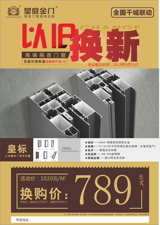 新時代的人們懂生活、品生活、享生活,提倡節(jié)能、健康、時尚、綠色的環(huán)保生活。應(yīng)人們生活要求,皇庭金門催生出門窗以舊換新模式。這樣的營銷模式不僅降低了門窗的生產(chǎn)成本,同時又做到了低碳環(huán)保,可謂是無可挑剔的好方法。