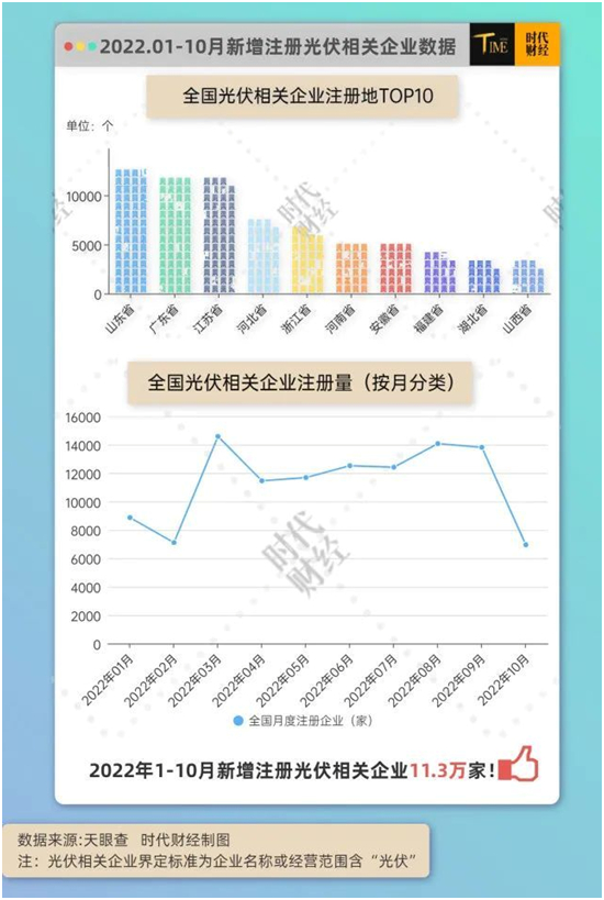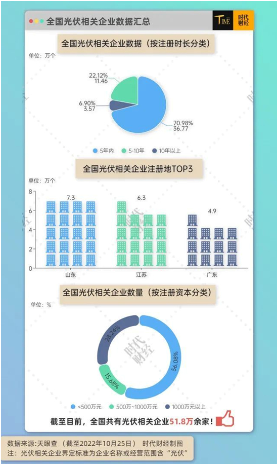 根據(jù)天眼查10月25日提供的數(shù)據(jù),截至目前,中國共有光伏相關(guān)企業(yè)51.8萬余家,其中11.3萬家為2022年以來新增。