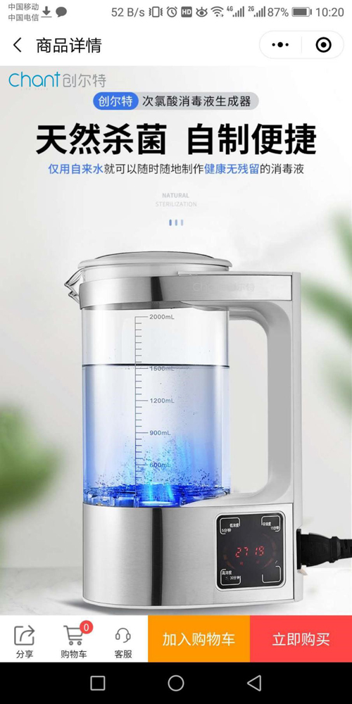 在此環境下,創爾特不斷創新,推出了三款適用于不同場景的消毒液制造器。該產品只需加入自來水和普通食鹽就可制造出次氯酸消毒液,可快速有效地殺滅大腸桿菌、金黃色葡萄球菌、流感病毒等有害微生物,殺菌率高達99%,滿足顧客的健康新需求。