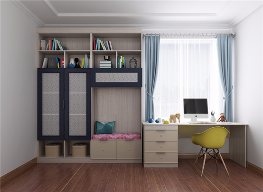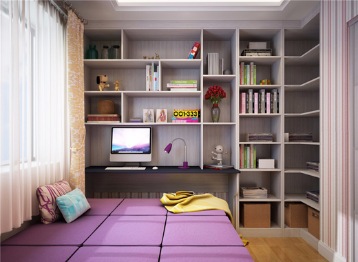 次臥另一側(cè)定制整面墻的置物架,算是為以后小孩學(xué)習(xí)需求留出空間。