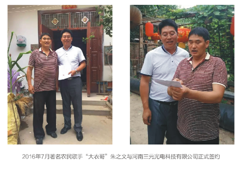 除了在遠紅外輻熱技術上的領先姿態,三元光電在品牌宣傳上也不遺余力。2016年7月,著名農民歌手“大衣哥”朱之文正式與河南三元光電科技有限公司簽約,成為三元光電·遠紅外品牌代言人。作為新型電熱行業的開創者,三元光電始終堅持“環保節能,溫暖民生”的核心理念。而朱之文大哥“踏實、務實、正派”的形象正好符合三元光電·遠紅外產品對老百姓的真誠服務。