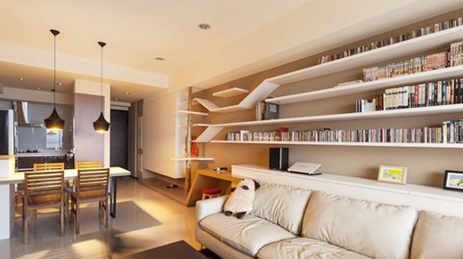 沙發的背景墻擱架也可以用來擺放書籍。或者是定制一個內嵌樣式的書架,與客廳的風格相呼應,不顯得突兀,又可以將閑置空間利用起來。