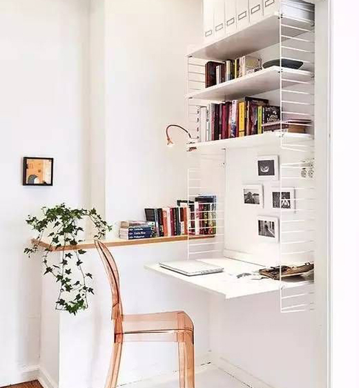 小戶型空間有限,陽臺等不常用的空間角落可以改造成個人小書房。在陽臺角落擺放一個定制的書柜,旁邊簡單的置上桌椅,就成了一個專屬小書房。設計以功能性為主,隔斷性的設計保證了書房的私密性,有效的利用了空間。