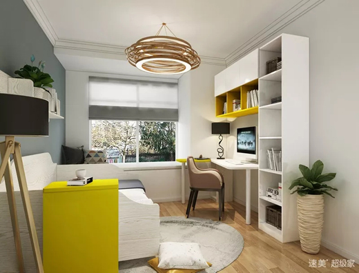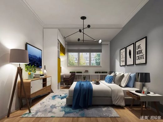 灰白黃的色彩搭配與客廳相呼應(yīng)。主臥帶電視并與書房一體化設(shè)計(jì),同時(shí)滿足看書觀影是大多數(shù)年輕人的需求。空間里的每一個(gè)物件,都力求質(zhì)感和追求完美,不管是藍(lán)灰搭配的床品還是木質(zhì)燈架的落地?zé)簦S多細(xì)節(jié)之處都在體現(xiàn)著居住人精致的生活品位,透著一股溫馨愜意的居室之感。