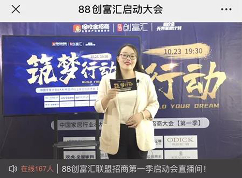 2020年9月27日由海創頂墻整體定制、浪鯨衛浴、瑪格全屋定制、歐迪克門窗、尚品本色木門、雙虎全屋家具、UIOT超級智慧家、御秀軟裝(按品牌拼音首字母排序)八大品類領軍品牌聯合程咬金招商攜手組建88創富匯 “筑夢行動”線上聯合招商大會全面啟動!并將于10月23日召開“筑夢行動”中國家居行業8大標桿品牌線上聯合招商大會【第一季】。為了這次聯盟招商會能取得輝煌戰績,8大品牌各部門全員參與,高度重視,接下來讓我們來回顧本次啟動大會的全部過程。