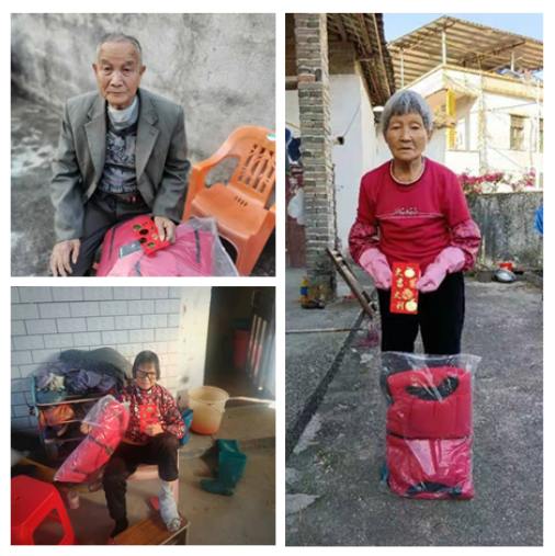 慰問走訪中,嶺咀村委會李書記一行人同老人們親切交談,詳細了解老人們身體情況和近期生活情況,并將新年紅包、冬日夾克背心等慰問品送給老人們,讓老人們實際感受到溫暖。